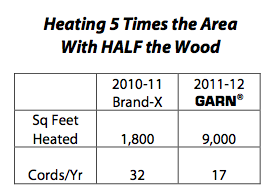 Daum and River sing the praises of their GARN® wood heating system. During the 2010-2011 heating season, they used a Brand X outdoor wood burner to heat their old 1,800 sq. ft. farmhouse, using 32 cords of wood and needing to load it twice a day every day from November through April to maintain a temperature of only 64 degrees on the coldest days.